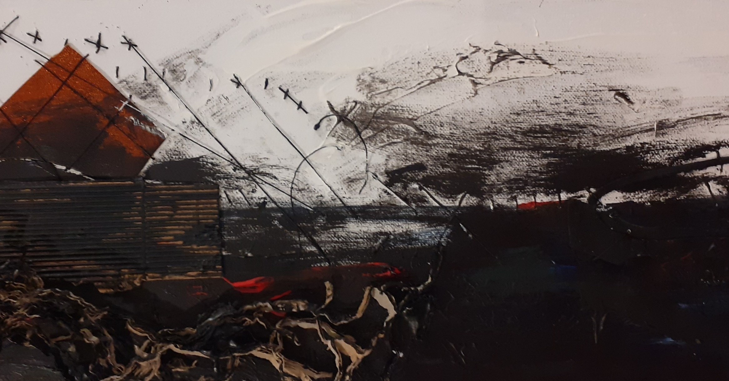 Acrylic, mixed media and stitching on canvas framed 2020 20 x 50cms